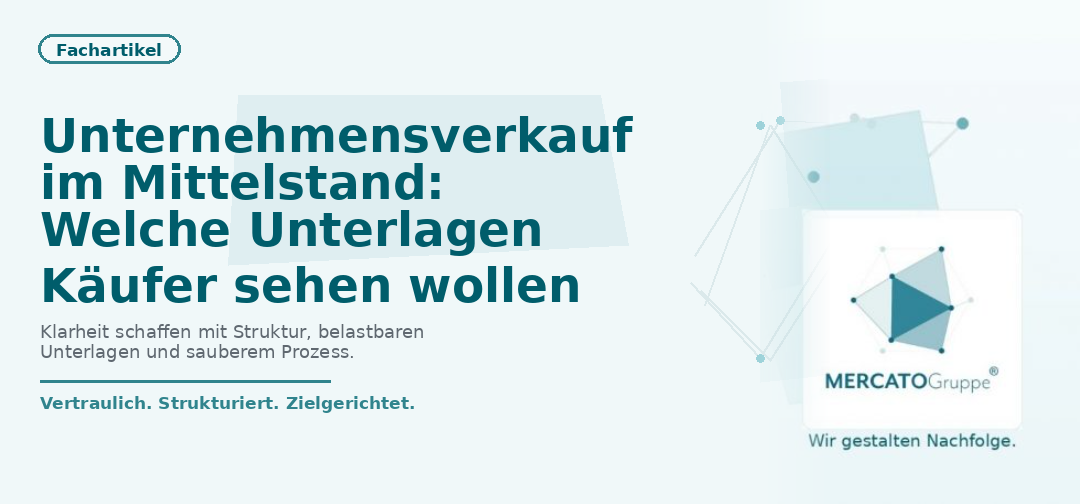 „Welche Unterlagen braucht ein Käufer eigentlich?“ Diese Frage stellt sich in fast jedem Unternehmensverkauf, häufig aber erst dann, wenn der Prozess bereits läuft. Gerade im deutschen Mittelstand ist eine gute Vorbereitung entscheidend, weil sie Vertrauen schafft, Rückfragen reduziert und den Ablauf deutlich strukturierter macht. Wer früh Ordnung in die wichtigsten Informationen bringt, schützt nicht nur den Prozess, sondern oft auch den Wert des eigenen Unternehmens.